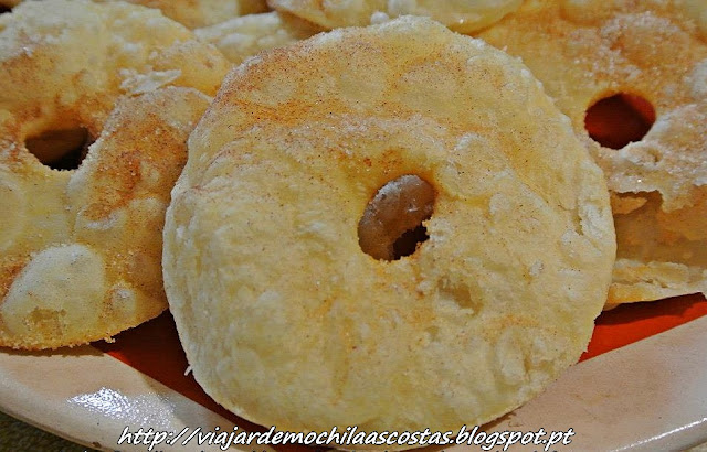 Depois das fatias escorridas em papel absorvente, polvilham-se com açúcar e canela.